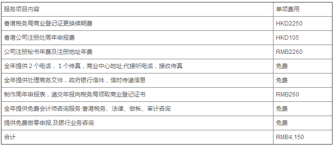 4、注册地址费用:是在香港成立公司的必备条件,我司可提供,首年免费,翌年起,按年度收取;